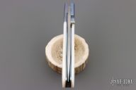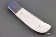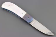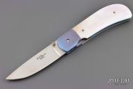 This linerlock folder by Eldon Peterson features a hand-rubbed satin polished finish blade with single thumbstud. The handle features dovetailed anodized titanium bolsters, and liners with Mother of Pearl scales. Has a chip in one side of the scale. Has a couple light scuffs, and scratches, excellent condition otherwise.