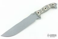 This Anorexic Fusion Battle Mistress by Busse features a silver coated blade with .219" blade thickness and 2.214" blade depth, full tang construction. The handle has black/tan G-10 scales. New from maker!