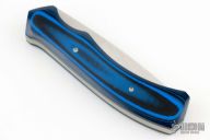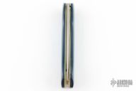 This left-handed Sidewinder II scale-release auto by Rainy Vallotton features a satin finished partially serrated blade with nail nick. The handle has black/blue g10 scales, titanium liners, stainless steel backspacer. #43. Nice action, lockup and blade seating. Has a couple light scratches, otherwise excellent condition. Comes with a zippered case.