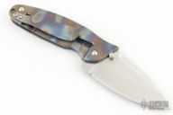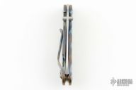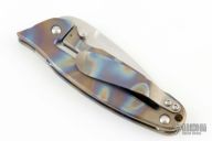 This framelock flipper by Steve Ryan features a satin finish spear point blade with false top edge and dual thumbstuds. The handle has a flamed titanium frame with a matching tip up titanium clip. Nice detent, blade seating and lockup. Comes with a zippered case. Has some light scuffs and scratches, great condition otherwise.