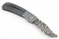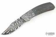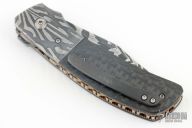 This linerlock folder by Mike Tyre features a Damascus blade with flipper tab. The handle has Damascus bolsters, carbon fiber scales, fileworked and textured anodized titanium liners and a fileworked stainless steel backspacer. Nice detent, lockup and blade seating. Comes with zipper case and Maker's card. Excellent condition.