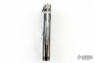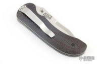 This knife by Joe Pardue features a satin finished blade with dual thumbstuds and notched thumbramp. The handle has carbon fiber scales, orange peel finished titanium liners, tip down black stainless steel clip. Nice detent, and lock up, blade favors the right side slightly. Comes with a zippered case. Has a couple light scuffs and scratches, excellent condition otherwise.