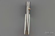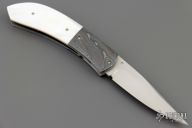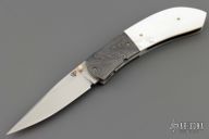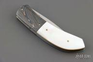 This Gentleman's Linerlock by Aaron Frederick features a hand rub satin finished blade with a single thumbstud. The handle has Damascus bolsters, mother of pearl scales, satin titanium liners and backspacer. Nice detent, lockup and blade seating. Excellent condition. Comes with a leather pouch.