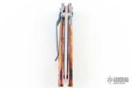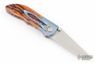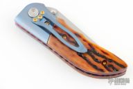This early folder by Allen Elishewitz has a tumble finish blade with dual thumbstuds. The handle has anodized titanium bolsters, jigged bone scales, anodized titanium liners and tip down clip. Nice lockup, detent, and seating. Has a couple light scratches, otherwise excellent condition.