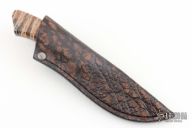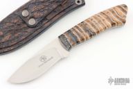 This "Wolverine" by Arno Bernard is part of the "Scavenger" series of knives. This piece has mammoth tooth handle scales with black liners. Hand rubbed satin finish blade with .135" blade stock and .985" blade depth, full tapered tang construction. Includes a brown leather sheath, box and COA. Excellent condition.