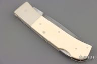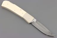 This Damascus Lockback folder by Frank Centofante features a clip point blade with nail nick. The handle has nickel silver bolsters and nickel silver liners, mammoth ivory scales, stainless steel lockbar and black linen micarta backspacer. Has a couple light scratches, otherwise excellent condition.