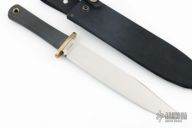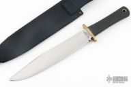 This Trail Master bowie by Cold Steel features a satin finished clip point blade with a false top edge, .299" blade stock and 1.499" blade depth, hidden tang construction. The handle has a brass guard and a rubber handle. Comes with black nylon sheath. Has some light scratches and light patina, otherwise good condition.