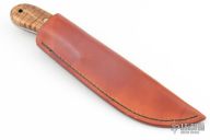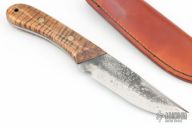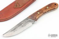 This Hunter by Steven Kelly features a forged drop point blade with satin finished grinds, .156" blade stock and 1.508" blade depth, full tang construction. The handle has wood brass pins, and lanyard hole. Comes with a brown leather sheath. Has some light scuffs and scratches, excellent condition.