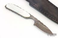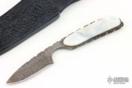 This Neck Knife by Herb Derr features a Damascus blade, fileworked bladespine, .120" blade depth and .753" blade depth, full tang construction. The handle has mother of pearl scales. Comes with a leather belt sheath with crocodile panel. Has some light scuffs and scratches, Excellent condition otherwise.