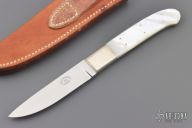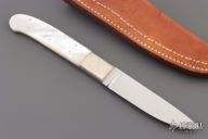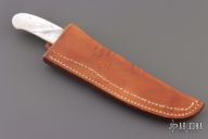 This knife by Corbit Signman features a mirror polished blade, .128" blade stock and .686" blade depth, full tapered tang construction. The handle has dovetailed nickel silver bolsters, pearl scales with nickel silver pins. Comes with a brown leather sheath. Dated 1982. Has a couple light scuffs, and patina, excellent condition otherwise.