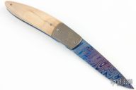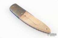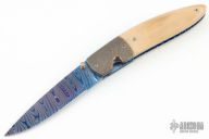 This folder from Theuns Prinsloo features a blued Damascus blade with a single thumbstud with diamond inset. The handle has dovetailed and textured titanium bolsters, mammoth ivory scales over fileworked and anodized titanium liners and backspacer that has petroglyph etchings. Comes with a zippered case. Excellent condition.