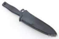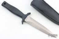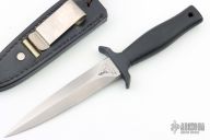 This Mark 1 dagger by Gerber is double-edged and hand rub satin finished, .256" blade stock and .958" blade depth, hidden tang construction. Black coated aluminum handle. Comes with black leather sheath with boot clip. #100209. Has some light scuffs, otherwise excellent condition.