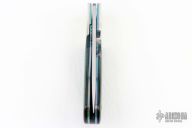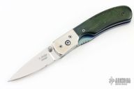 This knife by Pete Shulga features a mirror polish finished blade with single knurled thumbstud. The handle has dovetailed stainless bolsters, green scales, anodized titanium liners and micarta backspacer. Nice detent, and lockup. Blade favors the right side. Has some light scuffs and scratches, excellent condition otherwise.