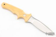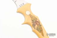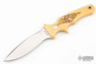 This Mini Fighter by Jimmy Lile features a satin finished blade, .137" blade stock and .813" blade depth, full tapered tang construction. The handle has yellow paper micarta scales and nickel silver pins. Scrimshaw done by James W Stewart and dated 1980. Excellent condition.