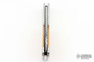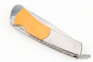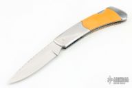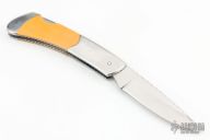 This vintage lockback by Musick Handmade features a mirror polished blade with nail nick with fileworked blade spine. The handle has stainless bolsters, fileworked spring, and fileworked liners. The scales are yellow micarta. Comes with zipper case. Has some light scuffs and scratches, great condition otherwise.