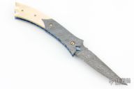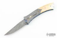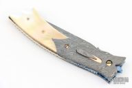 This custom automatic by Dale Reif features a Damascus blade with carved ricasso. The handle has Damascus bolsters, Damascus and 14kt gold rockerbar, gold lip pear scales, gold plated screws, fileworked and anodized titanium liners with jeweled interiors, fileworked stainless steel and 14kt gold backspacer. Nice lockup and blade seating. Has some light scuffs, otherwise excellent condition. Comes with a velcro case.