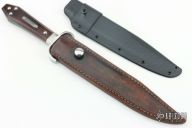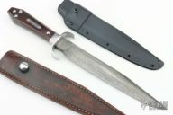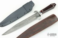 This Hells Bell Bowie from Bill Bagwell features a Cable Damascus blade with sharpened top edge, .316" blade stock and 1.475" blade depth, hidden tang construction. The handle has a steel guard and spacer with a cocobolo handle and stainless steel hardware. Comes with a brown leather sheath and a custom kydex sheath. Comes with a zippered case. Excellent condition.