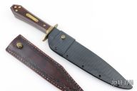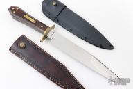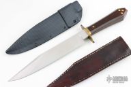 This Bowie from Master Smith Bill Bagwell features a mirror polished clip point bowie style blade with sharpened top edge, .351" blade stock at the ricasso and 1.480" blade depth, hidden tang construction. The handle has a brass guard and collar, cocobolo grip with brass studs. Includes a hand tooled brown leather sheath, custom kydex sheath with belt stud and a zippered case. Has a little oxidation on the ricasso, otherwise excellent condition.