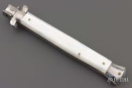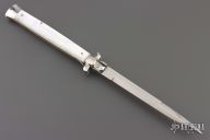 This 13" swivel bolster features a polished bayonet ground blade. The handle has stainless steel bolsters, front and rear, Pearlex scales, brass liners, stainless spring. Has some light scratches and oxidation on the backspacer, otherwise good condition.
