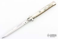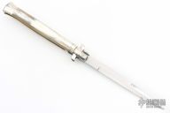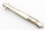 This 13" Picklock Auto by AGA Campolin features a polished bayonet ground blade with false top edge. The handle has nickel silver bolsters, front and rear, honey horn scales, brass liners, stainless spring. Has a few light scratches, otherwise excellent condition.