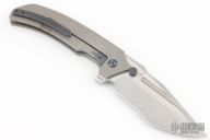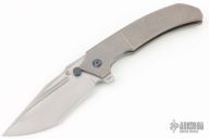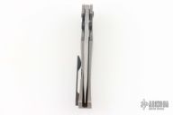 This Satori by Custom Knife Factory is a Peter Rassenti Design, the blade is satin finished with notched thumbrest and flipper. The handle has a tumbled titanium frame with tip up black titanium clip, lanyard hole, stainless lock face insert with overtravel stop. Rides on bearings, nice detent, lockup and blade seating. #453 on flipper tab. Comes with nylon Velcro case and COA. Excellent condition.