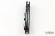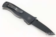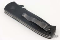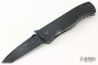 This CQC-7 by Emerson Knives has a tanto chisel ground tanto blade with notched thumbrest, wave features and a single thumbstud. The handle has G-10 scales, titanium liners, barrel spacers, and a tip up black stainless clip. S/N 12321. Nice detent, lockup and blade seating. Has some scuffs/scratches, otherwise good condition.