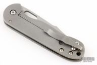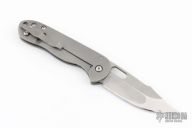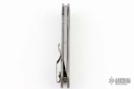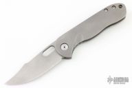This Tac 4 by Jeremy Horton features a chisel ground blade with a polished convex grind tip and thumbhole. The handle has a tumble finished titanium frame with a matching tip up clip and titanium barrel spacers. Has the Horton Shield stamp on the clip. Has nice detent, blade seating and lockup. Has a couple scuffs on the blade and frame, otherwise excellent condition.