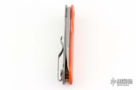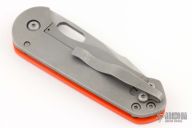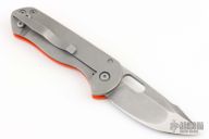 This Shawty by Jeremy Horton features a tumble finished blade with a chisel grind and a convex grind tip and thumbhole. The handle has an orange G-10 and tumble finished titanium frame with a matching tip up clip and titanium barrel spacers. Has nice detent, lockup and blade seating. Has some scratches, otherwise excellent condition.