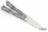 Spyderco's original SmallFly was a uniquely different "spin" on the balisong, or Filipino butterfly knife. Now this remarkable design is back with this special limited featuring full-flat-ground, drop-point blade profile crafted from CPM-Cru-Wear. Like the original, it features skeletonized twin handles with full stainless steel liners and peel-ply-textured Gray G-10 scales. The Round Holes at the butt end of both handles reflect Spyderco's iconic trademark and help achieve optimal balance for high-speed manipulation. A spring-loaded latch attached to the "free" handle secures the handles together in the closed position, while the removable wire pocket clip may be attached to either side of both handles as both a carry option and tactile index.