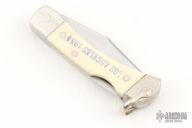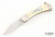 This 1984 Olympics Commemorative with Gary Blanchard Scrimshaw was made by Schrade. It has a satin finished blade, nickel silver frame, white inlays with blue scrimshaw. Comes with original box and papers. #1376 on bolster and box. Excellent condition.