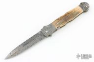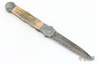 This Auto by Ken Steigerwalt features a Damascus dagger blade with false top edge. The handle has scalloped and fluted Damascus bolsters, front and rear, mammoth ivory scales, fileworked nickel silver liners, stainless steel backspacer. Nice action, lockup and blade seating. Comes with a zippered case. Excellent condition.