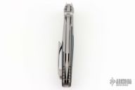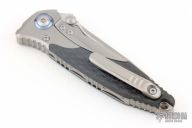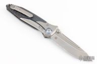 This Socom Bravo by Microtech is made in China by Rike Knife, it features a bead blasted partially serrated blade, notched thumbrest, and dual thumbstuds. The handle has bead blasted titanium bolsters/liners, bronze anodized pivot collars, carbon fiber scales. Tip up carry bead blasted titanium clip. Bead blasted titanium backspacer. Dated 04/2022 and s/n 1008. Comes with original box and papers. Box is signed. Excellent condition.