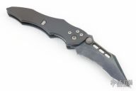 This Vector manual folder from Microtech features a black partially serrated blade with dual thumb studs and notched thumb ramp. The handle is comprised of black anodized aluminum frame with non slip inserts over silver barrel spacers. Stainless steel inlaid lockbar. No clip. Includes zipper case. Has some scuffs and scratches, otherwise good condition.