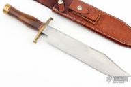 This I-XL Bowie blade by George Wostenholm and Son was given a handle by Randall Made Knives. It features a satin finished blade with false top edge, .229" blade stock and 1.919" blade depth, hidden tang construction. The handle has a lugged brass guard, walnut grip and a brass butt, red/white/blue spacers. Comes with a brown leather sheath that is marked "IXL 10" on the back and "Randall Made Knives". Has some scratches and patina, otherwise excellent condition for its age.
