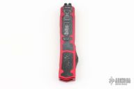 This Makora OTF automatic by Microtech features a black double edge blade. The handle has a black aluminum frame with nonslip inlays. Black stainless steel clip, tip down carry. Dated 01/2006 and 00463 on clip. Comes with zipper case. Fires hard. Has scuffs and scratches, chipped tip, good user condition otherwise.