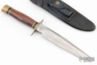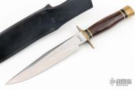 This Model A Fighter by Ralph Bone and Charles Hipp features a satin finished clip point blade with a sharpened top edge, .244" blade stock and 1.266" blade depth, hidden tang construction. The handle has a brass double guard and brass butt cap, rosewood grip with black and brass spacers. Has some scratches and patina, has been resharpened, otherwise good condition. Comes with a brown leather sheath. Stamped A 78.28