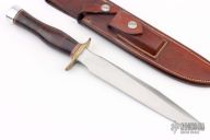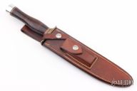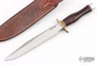 "The Model 1 by Randall Made Knives was made famous by Allied combat troops in World War II and has since been widely used in all theaters of war." This knife features a satin finished blade with a sharpened top edge, .210" blade stock and 1.110" blade depth, hidden tang construction. Brass guard, stacked leather Commando style handle with red/white/blue spacers, and a duralumin butt cap. Includes a brown leather sheath. Has somes scratches and patina, otherwise good condition for its age!