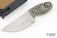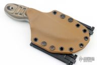 This Plan A from Mr. Horton features a chisel ground blade with swedge, .297" blade stock and 1.59" blade depth, full tang construction. The handle has green/black/tan g10 scales. Comes with kydex sheath with belt clips. Has scuffs and scratches good condition otherwise.