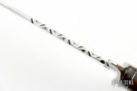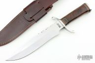 This knife by Impact Custom Knives features a high satin finished blade with fileworked spine and false top edge, .183" blade stock and 1.756" blade depth, hidden tang construction. The handle has a stainless steel guard and butt, dark wood grip with black and stainless steel spacers. Comes with a brown leather sheath. Excellent condition.