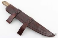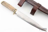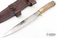 This Bowie features a satin finished blade with false top edge, .234" blade stock and 1.480" blade depth, hidden tang construction. The handle has a brass guard and butt, stag grip with wood spacers. Comes with a brown leather sheath. Has some oxidation and scratches, otherwise good condition.