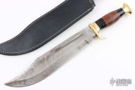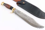 This Outback Bowie features a Damascus clip point blade with false top edge, fullers, .220" blade stock and 2.452" blade depth, hidden tang construction. The handle has a brass guard and butt with stacked leather grip with buffalo horn and brass spacers. Comes with a brown leather sheath. Has some oxidation and patina, otherwise good condition.