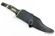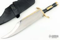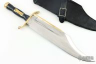 This Musso style Brass Back Bowie by Art Wiman features a mirror polished clip point blade with sharpened top edge, large fuller on one side, and a brass parry guard on blade spine, .320" blade stock, 2.857" blade depth, hidden tang construction. The handle has a brass S-guard and butt with black grip with a brass escutcheon. Comes with a black leather sheath. Has scratches, small dings, patina, has been resharpened, otherwise good condition.