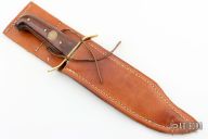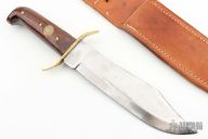 This bowie by Robert Birch features a satin finished blade with a false top edge, .222" blade stock and .287" blade depth, full tang construction. The handle has a brass guard with oak scales and brass pins, has an 1859 US Penny inset in the handle. Coems with a brown leather sheath. Has some scratches and oxidation, fair condition otherwise.