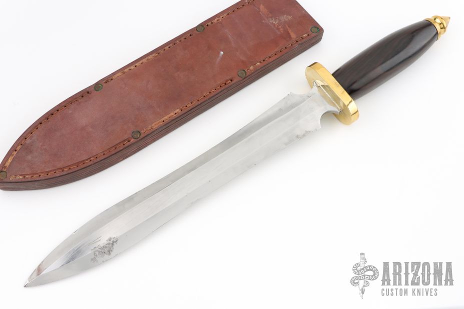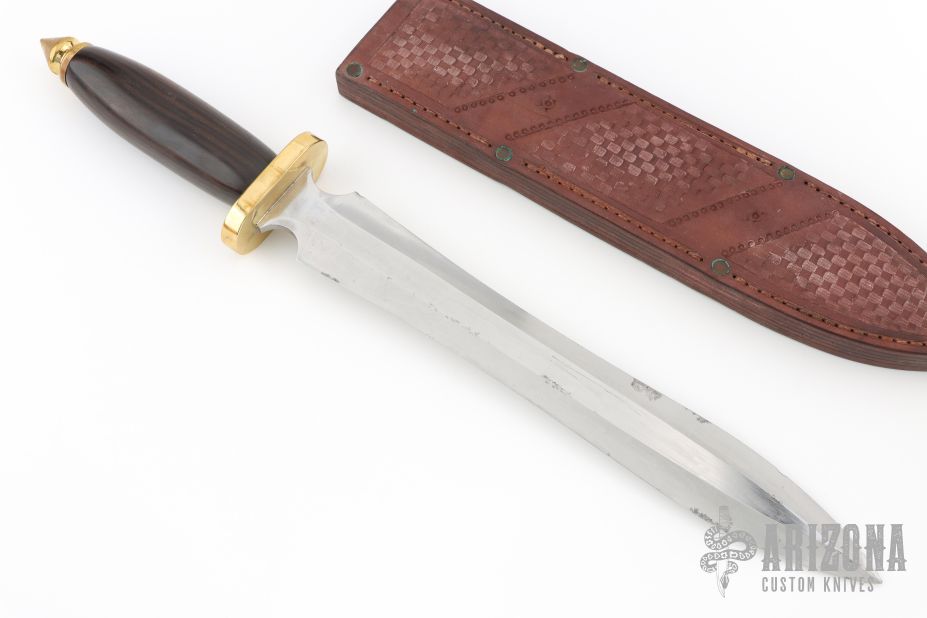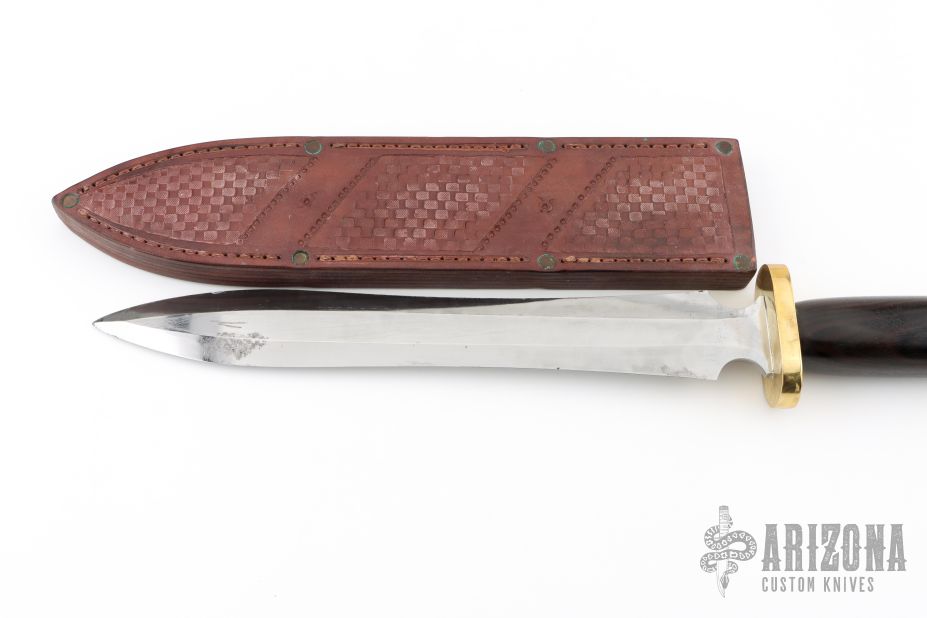 This Gladius Dagger features a polished double edged blade with .241" blade stock and 1.822" blade depth, hidden tang construction. The handle has a brass guard and butt, rosewood grip. Comes with a hand tooled brown leather sheath, sheath is a little tight and tough to remove knife from. Has scratches, dings in the blade edges, some light pitting, fair condition. This thing looks like it was in a battle!