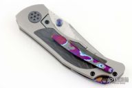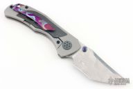 Grace comes in both inlay and non-inlay versions. This particular premium configuration features upgraded zirconium accents (clip, spacer, thumbstuds, pivot screw), Fat Carbon black camo carbon fiber inlays, bead blasted handles, and a hand ground belt satin Bohler M390 blade.