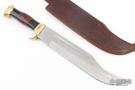 This Outback bowie features a satin finished clip point blade with false top edge, fullers, .189" blade stock and 2.171" blade depth, hidden tang construction. The handle has a brass guard and butt with stacked leather and buffalo horn grip. Comes with a brown leather sheath. Excellent condition.