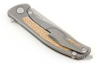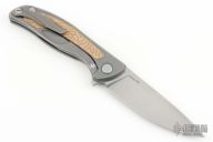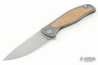 This F95NL framelock from Shirogorov features a flat ground tumble finished Chromax PM blade with notched flipper. The handle has a tumble finished titanium frame with yellow crazy micarta inlay complimented by a matching tip up clip and a single titanium barrel spacer at the butt along with a lanyard hole. Excellent lockup, strong detent, and nice seating. Includes the original box and papers. Excellent condition.