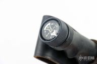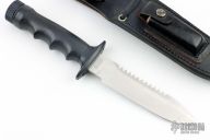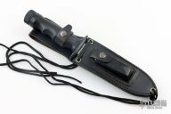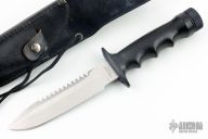 This vintage Commando knife by Life Knife features a satin finished blade with false top edge and sawteeth on the spine, .174" blade stock and 1.212" blade depth, hidden tang construction. The handle has a black aluminum guard with a black aluminum handle and removable butt cap with a compass. Has survival items in the handle. Comes with a black leather sheath. Has some scratches and minor wear on the handle, excellent condition for it's age.