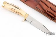 This Hunter from Kershaw was made by Dan Harrison and is numbered 01396. It has a satin finished blade with false top edge, .187" blade stock and .932" blade depth, hidden tang construction. The handle has a brass guard and butt with a stag grip. Hand signed by Dan Harrison and #01396. Comes with a brown leather sheath. Excellent condition.