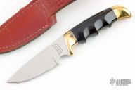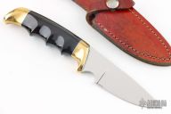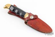 This Model 1030 Deer Hunter by Kershaw Knives features a mirror polished drop point blade with notched thumbrest, .161" blade stock and 1.195" blade depth, hidden tang construction. The handle is comprised of brass guard and pommel, steel spacers and hand contoured phenolic handle. Includes leather sheath with belt loop. Has some scratches, has been resharpened, otherwise good condition. This model has been discontinued.
